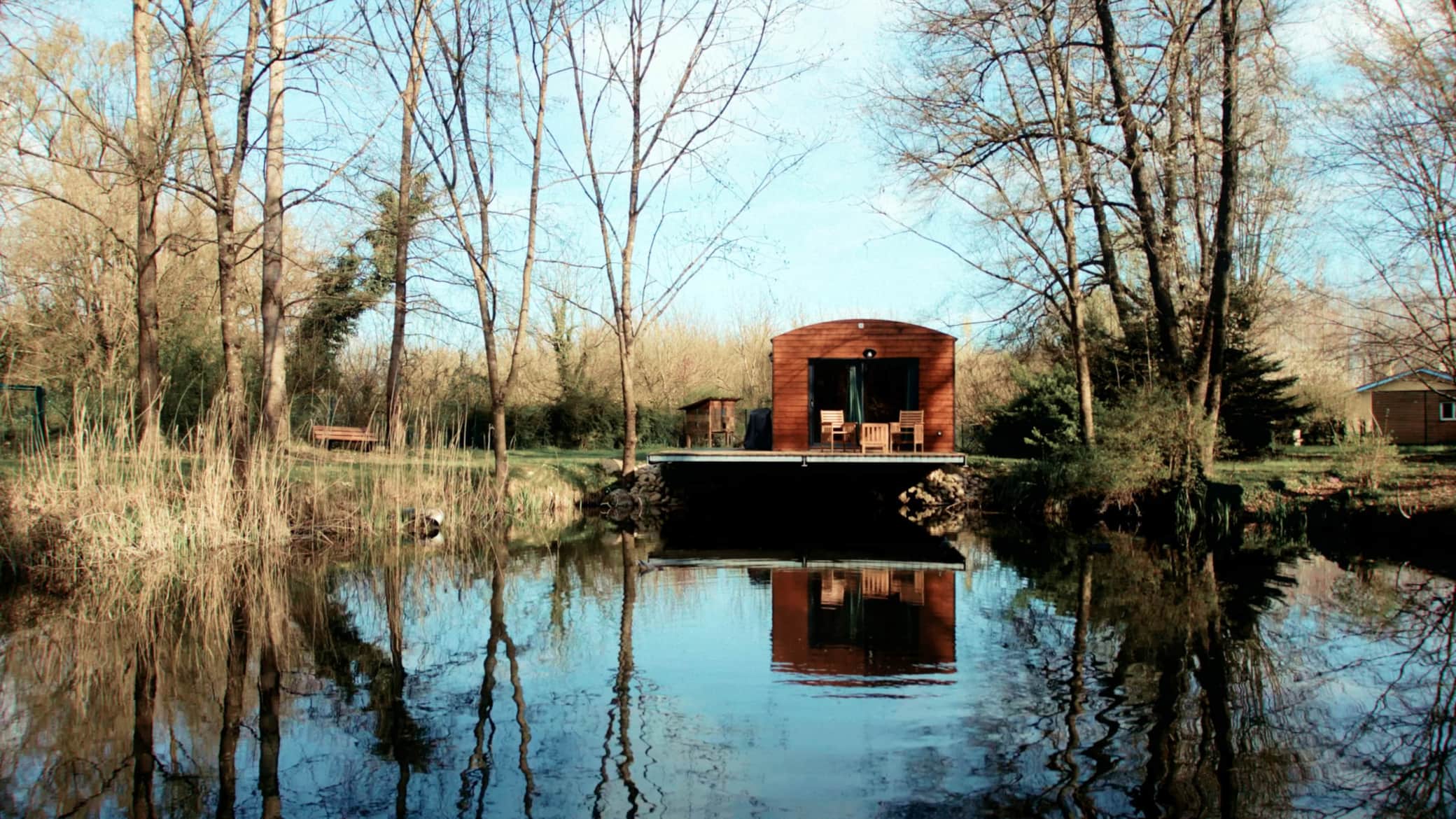 À 1h de Lyon, 25 min de Valence et 45 min de Grenoble, offrez-vous une parenthèse nature avec, pour chaque chalet, sa terrasse privée — l’une au-dessus de l’eau, l’une dans les arbres, l’une sur un îlot.